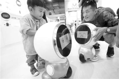 5月12日,北京,孩子在家长的陪伴下与具有安全陪伴功能的智能教育机器人互动。陈晓根 摄/视觉中国