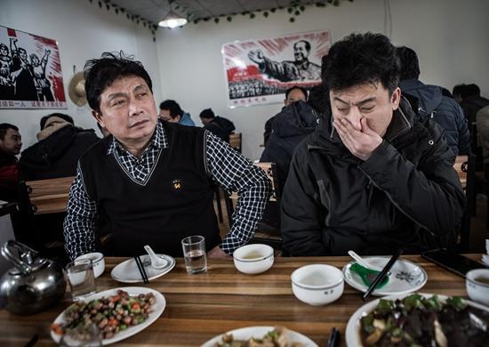 2016年12月26日,球墨厂附近的一家餐厅,宋巍(右)与选择内退的工友吃散伙饭。聊到动情处,已决定去兰陵新厂区工作的他捂住了脸。