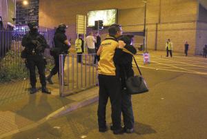 ■在英国曼彻斯特,警察在发生爆炸的体育馆外警戒。一对男女紧紧相拥相互安慰。