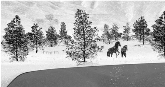第二幅是黑白的,一辆行驶在雪地里的汽车。在阿巴斯的电影里,汽车是不可少的,透过车窗,能看到两匹马在雪地里嬉戏。车停了,摇下半扇车窗,一半画面变亮,看完两匹马嬉戏的全过程,车窗摇上,车驶出画面。