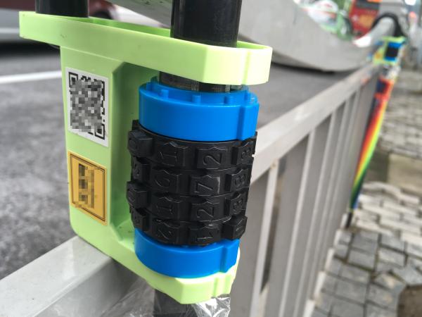 前一处投放点共有18把共享雨伞挂在人行道等市政设施上。这些雨伞由一层透明塑料套着,把手处还有一个二维码供用户扫描。记者扫描二维码后,系统提示,用户想使用共享雨伞,要先下载App或者关注微信公众号。澎湃新闻记者体验发现,使用前无需实名认证,只需支付20元的押金。在确认下单前,系统提示收费标准为1元/天。获取密码后,记者转动密码盘取出雨伞。除去缴纳押金的时间,整个取伞过程不到1分钟。