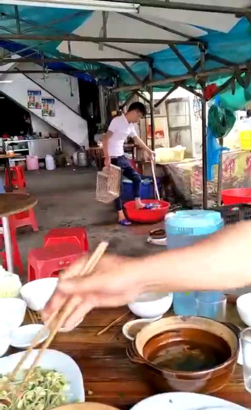 2017年5月23日,广东湛江一市民在一间狗羊大排档吃饭时看到大排档员工用脚来洗豆芽。