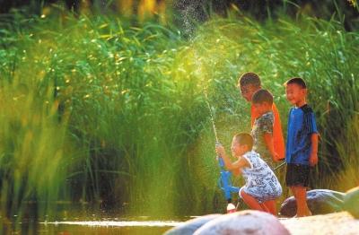 孩子们在郑东新区湿地公园嬉戏玩耍,尽享快乐童年。