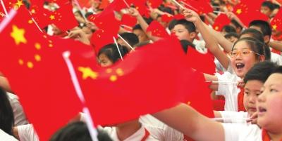 郑州市二七区政通路小学的同学们在少先队队会上挥舞国旗放声歌唱。