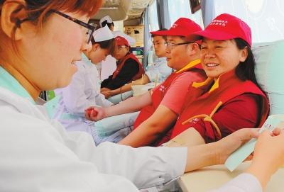 青年志愿者在义务献血,以实际行动践行“奉献、友爱、互助、进步”的志愿者精神。