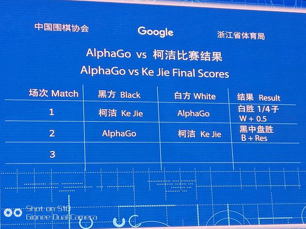 5月25日,人机大战第二局在桐乡举行。柯洁执白迎战AlphaGo。弈至155手,柯洁认负,AlphaGo执黑中盘胜,目前比分2比0,AlphaGo赢下与柯洁的人机大战。27日10:30进行三番棋第三局。
