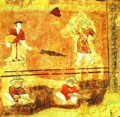 敦煌莫高窟五代壁画中描绘的“小满”节气后农人劳作场景,上图在扬场,下面正在割麦子。