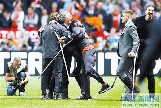 5月24日,曼联队教练穆里尼奥赛后同受伤队员庆祝胜利。新华社/路透