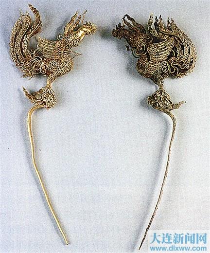 金首饰和佩饰330余件,包括簪、冠顶饰、镯、戒指、臂钏(缠臂)、佛像、花饰、耳环、坠子、串饰、扣饰等。在工艺方面采用了累丝、錾花、镶嵌、抛光等金细工技术。两件金凤簪的簪头为镂空立凤,昂首展翅,站在如意云之上。