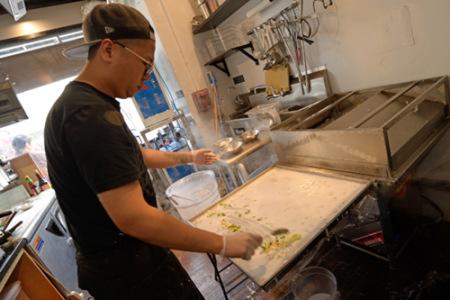 老板容永恒制作石磨肠粉。(美国《世界日报》/朱泽人 摄)