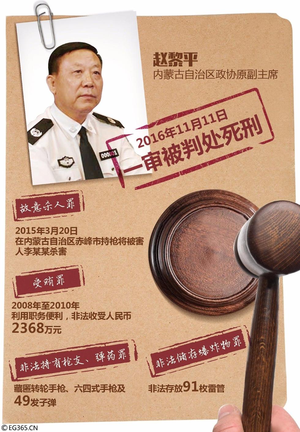 最高人民法院审理被告人内蒙古自治区政协原副主席赵黎平故意杀人、受贿、非法持有枪支、弹药、非法储存爆炸物死刑复核一案,近日依法裁定核准赵黎平死刑。2017年5月26日上午,山西省太原市中级人民法院遵照最高人民法院院长签发的执行死刑命令,对赵黎平执行了死刑。