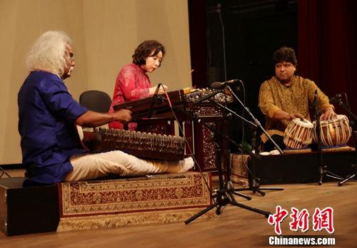 中新网北京5月26日电(上官云)当中国扬琴与印度扬琴(桑图尔)、塔布拉鼓相遇,会带给我们怎样动人的旋律?25日晚,北京现代音乐节“拉格·茉莉”中印文化交流专场音乐会在中央音乐学院音乐厅上演。在本场音乐会上,中印民族乐器演奏家们为满场的听众奉上一场音乐盛宴。