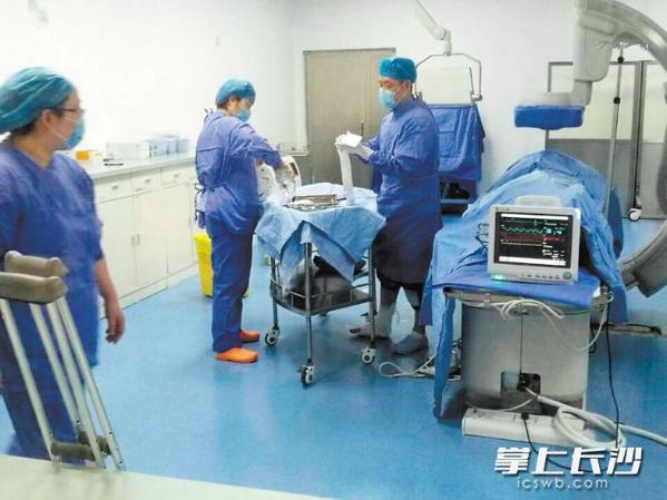 拐杖放在一旁,罗远健(右)脚打石膏、身穿铅衣为患者进行手术。 均为长沙晚报通讯员邵仪摄