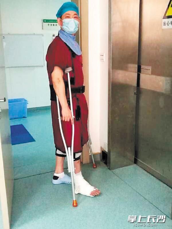 罗远健拄着拐杖、打着石膏上班。