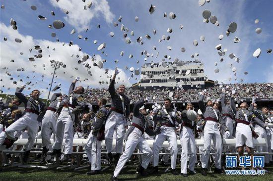 5月27日,在位于美国纽约州北部的西点军校,学员将帽子扔向空中庆祝毕业。