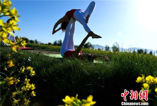 瑜伽爱好者在金灿灿的花田中练瑜伽。 王将 摄