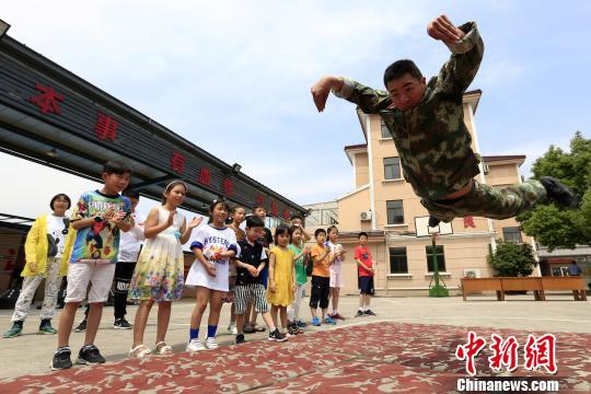 武警官兵在给孩子们演示摔擒基本动作。 陈杰(通讯员) 摄