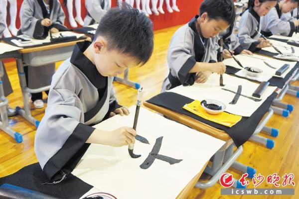 书 愿景 前日,周南秀峰学校举行了庆祝“六一”文艺汇演,一群身着青灰色汉服的孩子手握毛笔,浓墨重彩,书写了一幅幅“爱国宣言”。“有志向、有梦想、爱学习、爱劳动、爱祖国。”这短短15个字表达了孩子们热爱祖国,热爱生活的美好愿景。 长沙晚报记者 徐媛 摄