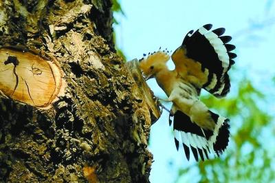 戴胜是以色列国鸟,在我国也有广泛分布,自古此鸟便有祥和美满的寓意。金色的羽冠、近似啄木鸟的喙、黑白相间的羽翼,煞是好看。熟悉公园环境的游客说,树洞里的这对戴胜居住时间不短了,前段时间生下了两个小宝宝,“这种鸟好看,还不怕人,常来公园的人都很喜欢它们。”昨天,就在大家观鸟时,一个细节引起了人们注意,戴胜“妈妈”口衔食物归巢,树洞内的雏鸟叽叽喳喳,戴胜“爸爸”却拦在树洞口,就像是在阻止“妈妈”给宝宝喂食一样。戴胜这样的举动引发了人们的猜想,每一种猜测都带着人类的善良。“爸爸不让妈妈给宝宝喂食,是希望宝宝能快点自己飞出去捕食,这是望子成龙的表现!”