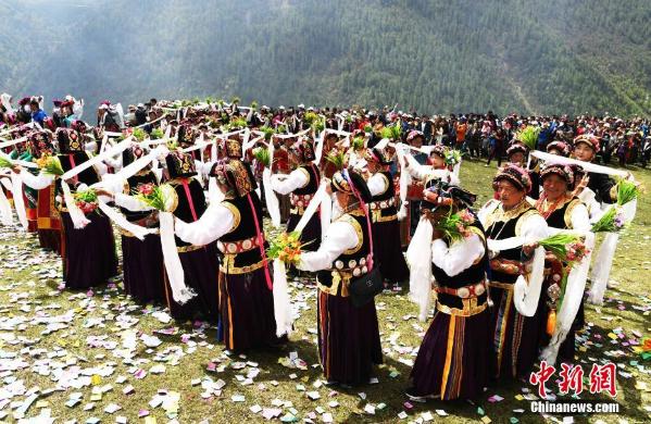 5月29日,“中国小金·四姑娘山传统朝山会”在四川省阿坝州小金县四姑娘山举行。数万民众通过古朴的宗教仪式和欢乐的民族歌舞,祭祀斯古拉神山,祈祷风调雨顺、五谷丰登、六畜兴旺。图为传统朝山会现场。 中新社记者 安源 摄