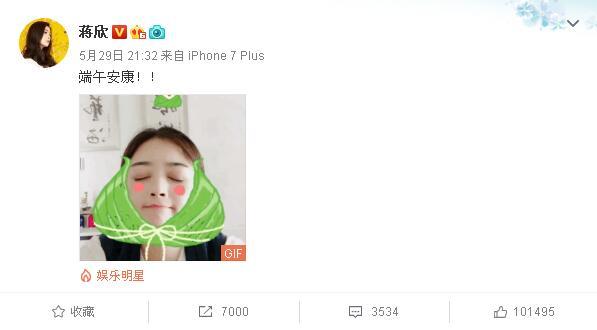 人民网北京5月30日电 (温璐)今日是端午节,明星纷纷在微博上送上祝福。《欢乐颂》里的“樊胜美”蒋欣秒变“粽子”,吐舌卖萌,十分搞笑。