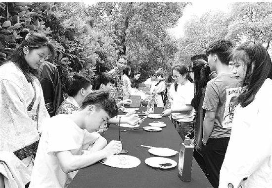 “书画端阳”活动——现场摆放着师生书画作品和传统文化知识展板,书法秀丽俊朗,国画小品生动清新,吸引师生们驻足观看。兰竹轩书画协会和文化市场经营与管理专业的同学们现场在凉扇上泼墨成画,他们精心绘制时令蔬果、江南景色等与端午相关主题的凉扇,妙趣横生,引人入胜。师生们只需在现场细细品味片刻,就可以拥有私人定制的凉扇。