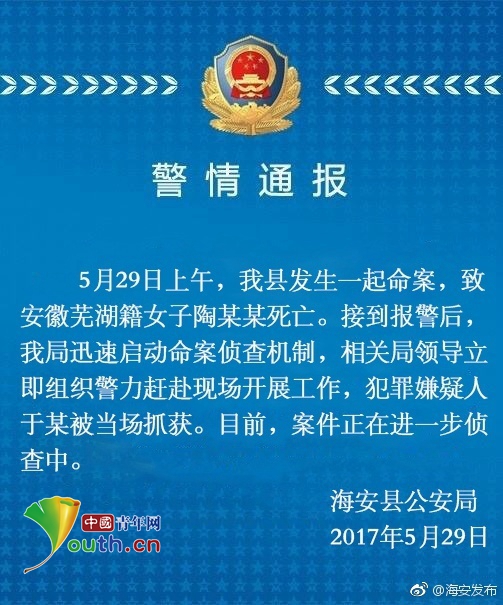 5月29日上午,海安县大公镇发生一起命案,安徽芜湖籍女子陶某某被人行凶杀死。据当地知情人介绍,杀人后,男子准备带尸逃跑,却不想途中出了车祸,犯罪嫌疑人于某被警方当场抓获。死者陶某某系安徽籍女子,在海安一家企业打工,与涉案嫌疑人于某发生矛盾后,冲动行凶,致使安徽女子受伤过重,不治身亡。
