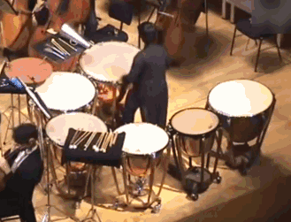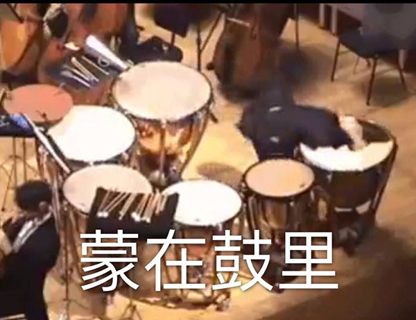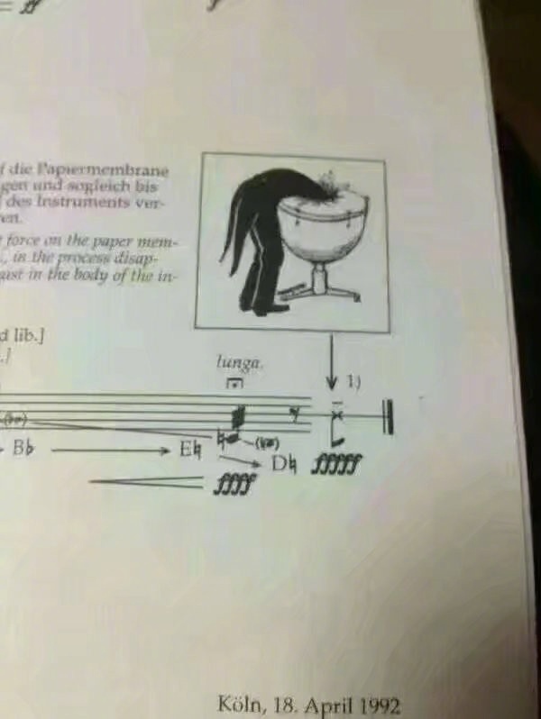 谱子最后标明,要让演奏者用尽全力一头扎进鼓里(这个鼓就是专门用来钻的,之前一直不敲),完成演奏。