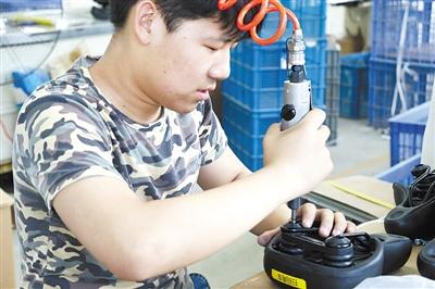 邢台友捷科技车业有限公司车座生产线上,工人正在为车座打减震球。关薇摄