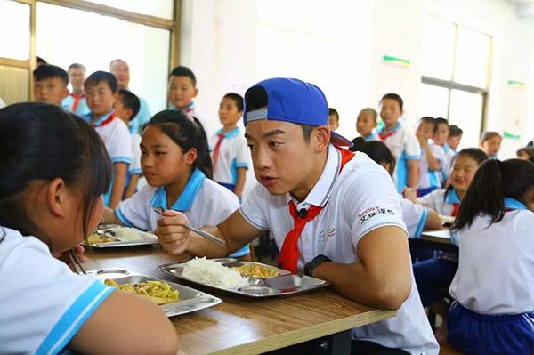 郑恺和志愿者代表一起来到食堂,为孩子们盛饭并和孩子们一起吃午餐。