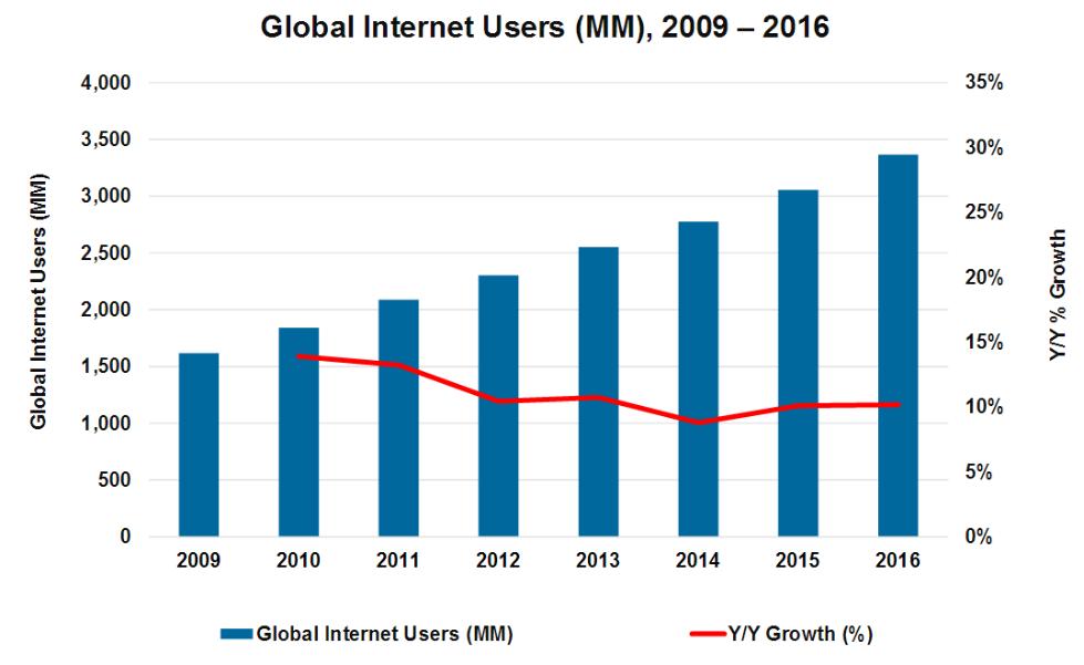 2009年-2016年,全球互联网用户增长情况及增长率