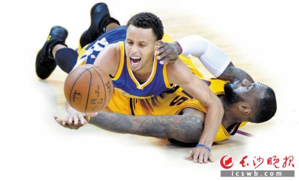总决赛即将开打,勇士骑士连续第三年在总决赛相遇,这两支分别由勒布朗·詹姆斯和斯蒂芬·库里领衔的队伍,将奉献怎样一场精彩大戏,令人期待。图为2015年6月9日,骑士队球员詹姆斯(右)和勇士队球员库里(中)在NBA总决赛第三场比赛中倒地争抢。 新华社记者 殷博古摄