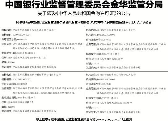 下列机构经中国银行业监督管理委员会金华监管分局批准,颁发《中华人民共和国金融许可证》,现予以公告。