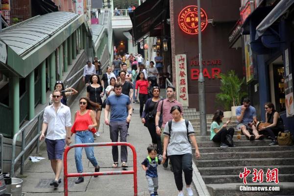游客从香港中环有盖行人扶手电梯旁边走过。中环有盖行人扶手电梯,整个系统全长800米,垂直差距为135米。根据《健力士世界纪录大全》,此系统是全球最长的户外有盖行人扶手电梯。中新社记者 洪少葵 摄