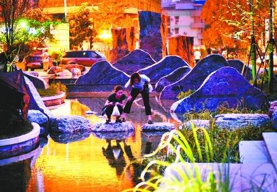 昨晚,在改造后的汉口江滩三峡石广场,游客在水景中的过水汀步石上观赏游动的鱼群。即将完工的广场以长江三峡为蓝本制作,一改过去仅有三座巨石的孤立印象,营造出两岸“峰峦叠嶂”,“山间”流水潺潺的生态景观。