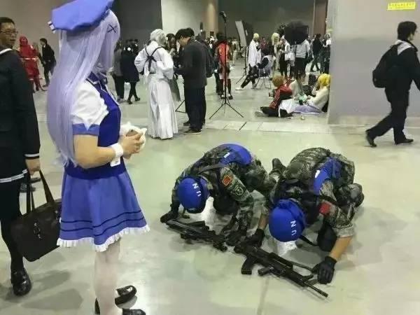 5月29日,网络上曝出,某漫展上,两名身着解放军迷彩服,穿戴单兵装具的“军人”,双膝跪地,95式枪支放在地上,正向一名骨骼清奇、打扮怪异的日式“少女”磕头。