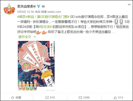 据了解,2016年,农夫山泉官方宣布与Bigbang5人签约代言。