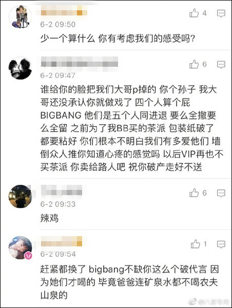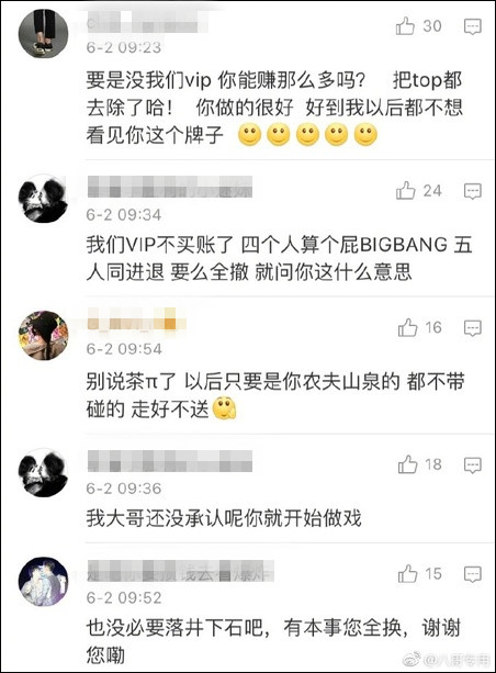 然而,6月2日,微博网友@八哥专用 曝出,由于在广告图中撤下了TOP,农夫山泉茶π官微6月1日的微博遭到了部分Bigbang极端粉丝的围攻。