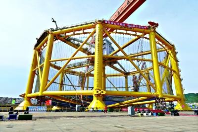 武船集团承建的挪威海上养鱼平台吊装完成后,形成一个直径110米、高69米的“巨无霸” 特派记者汪文汉 摄
