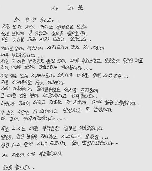 大家好,我是崔胜铉。首先因我的过错,给很多人造成了很大的失望及不便,真心的表示道歉。亲自站在大家面前来致歉的自己,我感到非常的羞愧。。。我没有任何的辩解,现在只是非常后悔,害怕所有一切。我将我的心情通过文字来小心的写下。因为这件事情给我的成员们、公司以及大众朋友们,喜爱我的粉丝朋友们,我的家人们,带来了无法挽回的伤痛。无论接受怎样的惩罚都是我应得的。非常心痛,连我自己也对自己感到非常失望。我会数千次数万次的来反省,再反省。更深刻的悔悟…绝不会再犯这样不负责任的错误,无法一一亲自向很多人去道歉。再次表示真心的道歉,我会深刻反省。我觉得自己非常的羞愧。对不起。
