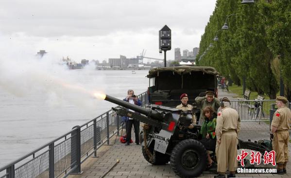 当地时间6月3日,加拿大蒙特利尔老港钟塔下举行仪式,纪念二战诺曼底登陆73周年。图为老兵们在圣劳伦斯河边鸣炮以志纪念。中新社记者 余瑞冬 摄