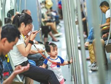 母女俩“手牵手”乘坐地铁。