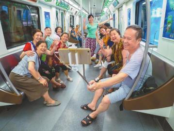 6月2日,成都地铁4号线二期正式开通试运营,家住温江区的周大爷和邻居、朋友一起,在乘坐的首发列车上拍照留念。