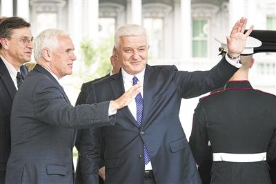6月5日,在美国华盛顿,黑山总理马尔科维奇(前右)与美副总统彭斯向人群挥手致意。 新华社发