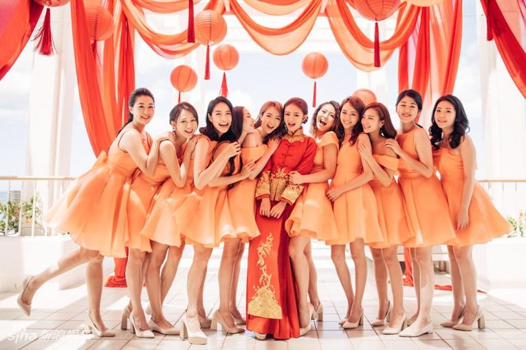 今天在夏威夷大婚,早上先进行中式迎娶仪式,澳门德晋集团CEO陈荣炼率10名兄弟团闯关,新娘子则有10姐妹花考验,包括安氏企业刘品言、白歆惠、夏于乔、Linda等人,伴娘团身穿粉橘洋装十分活泼,露逆天锁骨美翻。