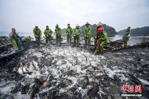 6月7日,在江西省新余市仙女湖,三个月的休渔期结束,渔民迎来开捕季。平均每天可捕捞生态鱼8万斤,吸引了浙江、江苏、湖南等地客商上门求购。近年来,新余市狠抓环境保护,通过取消网箱养鱼、封湖休渔、出台最严“护湖令”和环湖农村生活污水连片整治等举措,有效地保护了仙女湖一湖清水和“生态鱼”品质。同时,该市还把“生态鱼”养殖与精准扶贫有机结合,走出了一条“既要绿水青山、又出银水金山”的湖区农民脱贫路。周亮 摄