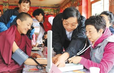 六月八日,“同心·共铸中国心”大型公益项目走进西藏林芝市,百余名来自首都医疗单位的医务志愿者奔赴西藏林芝市开展义诊。图为医务志愿者在为僧人测量血压。