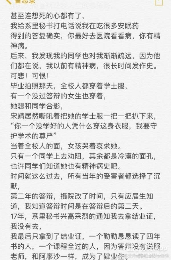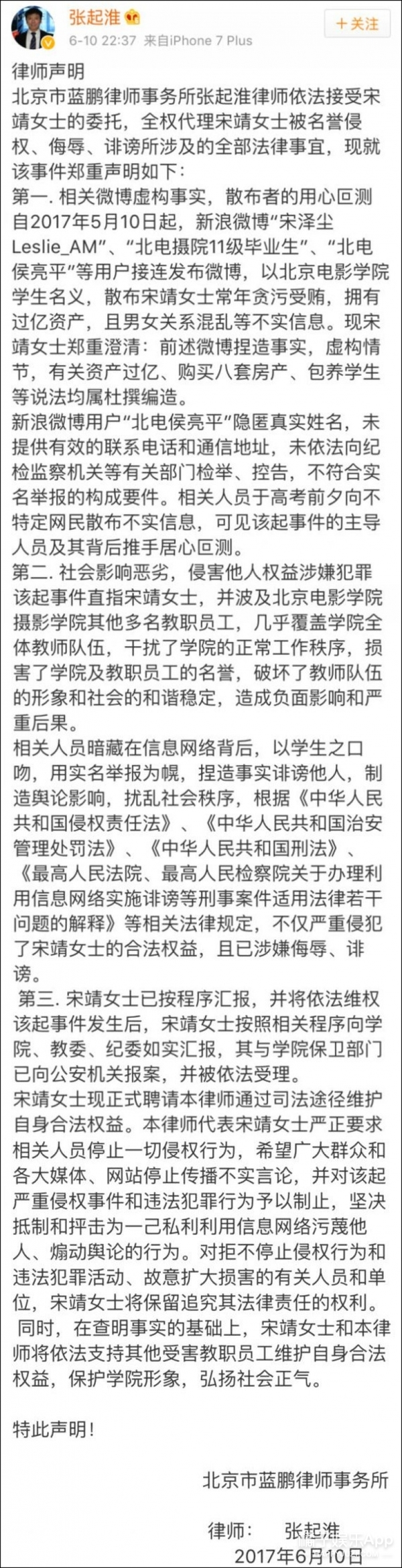 大概意思就是,微博上说的都是虚构的,爆料者居心叵测。这件事对学校和社会以及老师本人影响恶劣,构成犯罪。宋靖女士已经报案,将依法维权。