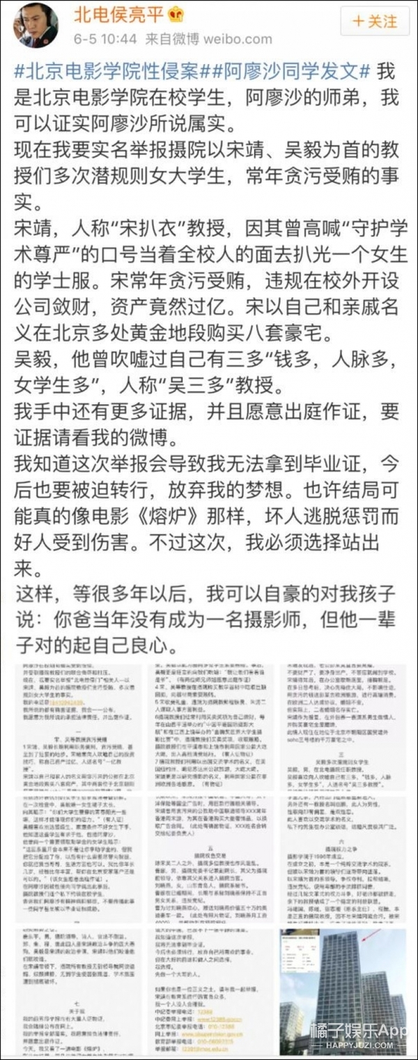 前几天,更是有一位自称是北京电影学生,阿廖沙师弟的网友,在微博上开设了@北电侯亮平 的账号,实名举报了北电摄影学院以宋靖、吴毅为首的教授们多次潜规则大学生,常年贪污受贿的事实。