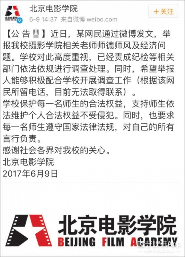 帖子一发引起了社会各界的广泛关注,北京电影学院官博表示“学校对此高度重视,一定会依法调查”
